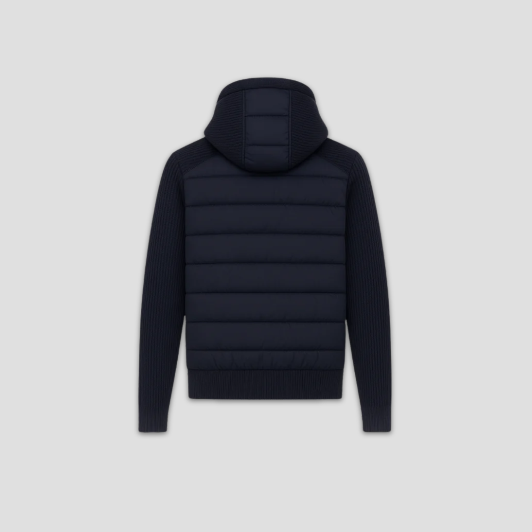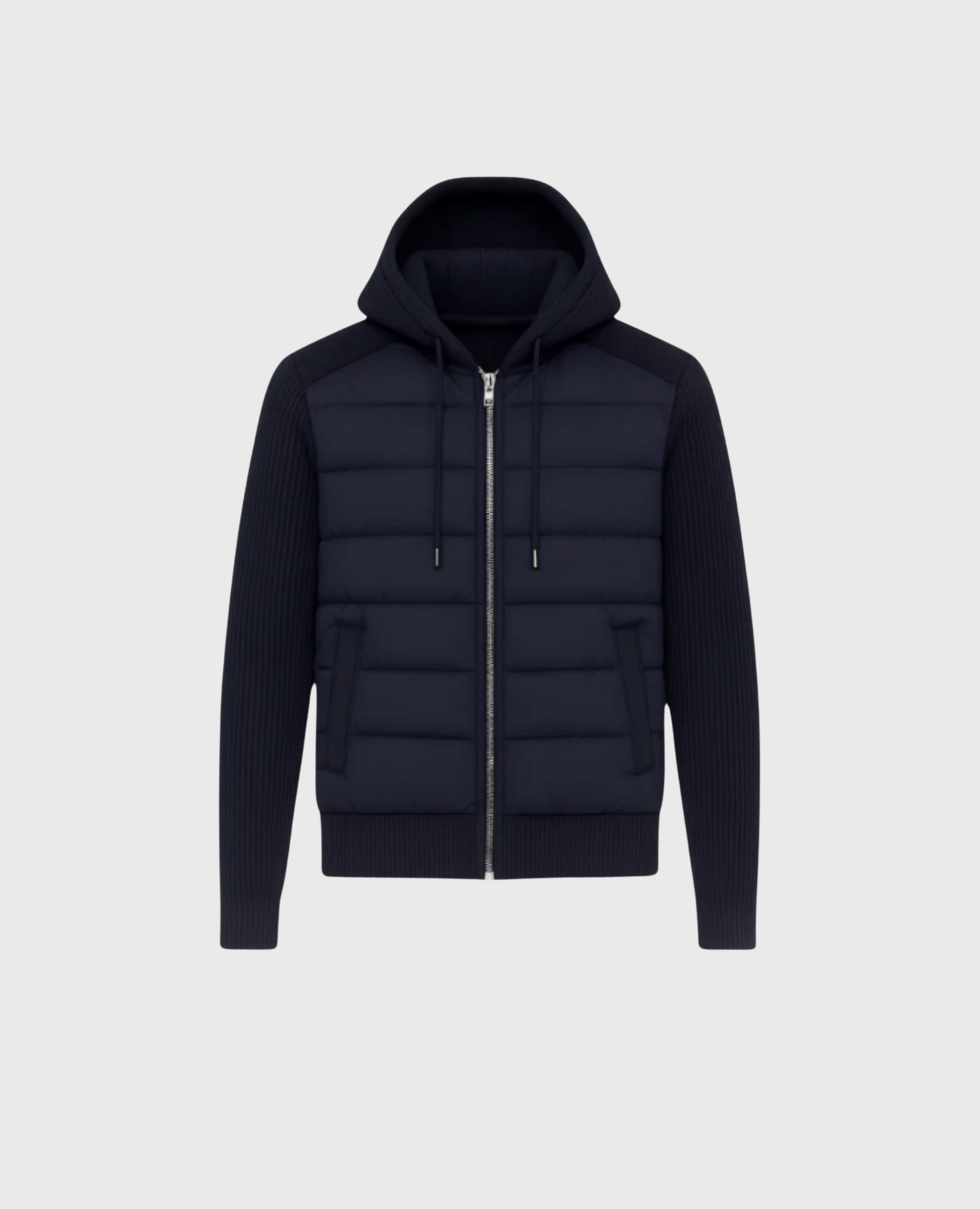 Denna hoodie i Midnight Navy omdefinierar modern ytterklädsel med sin kombination av prestanda och diskret lyx. Den har en slank, dunvadad kropp tillsammans med finribbotta ärmar, vilket ger en perfekt balans av värme, rörlighet och stilfull enkelhet. Passar för den som uppskattar funktionell minimalism med en sofistikerad touch. En tidlös och elegant del för ett modernt garderobsfavorit.