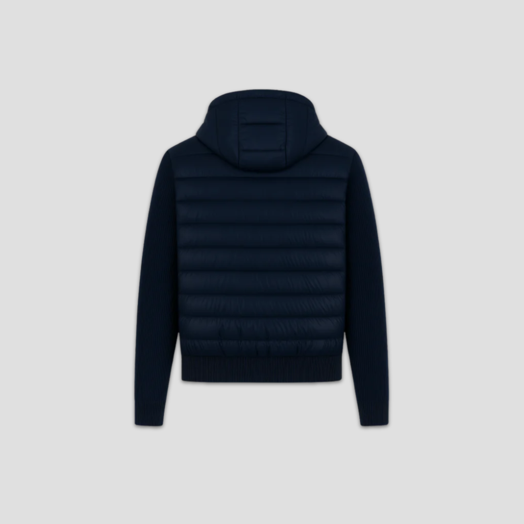 A sophisticated staple for daily luxury. This cardigan features a glossy quilted body paired with high-quality rib-knit sleeves and hood, offering a blend of warmth and style. Its sleek design ensures effortless elegance whether layered or worn on its own. An adaptable piece that adds timeless refinement to any wardrobe.