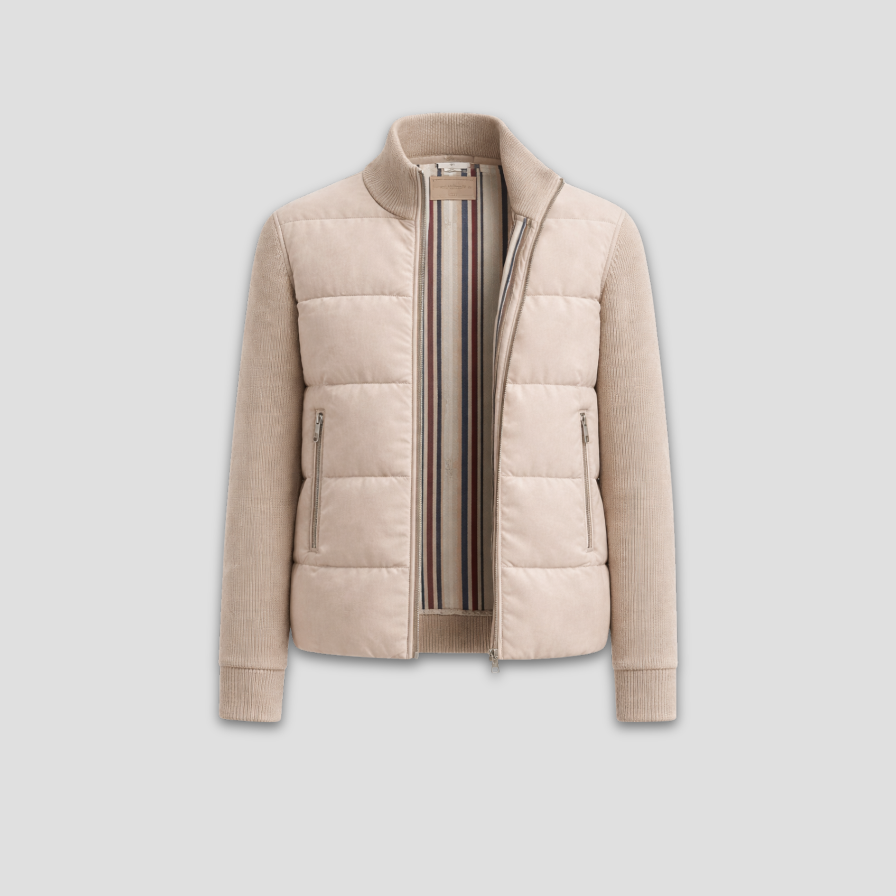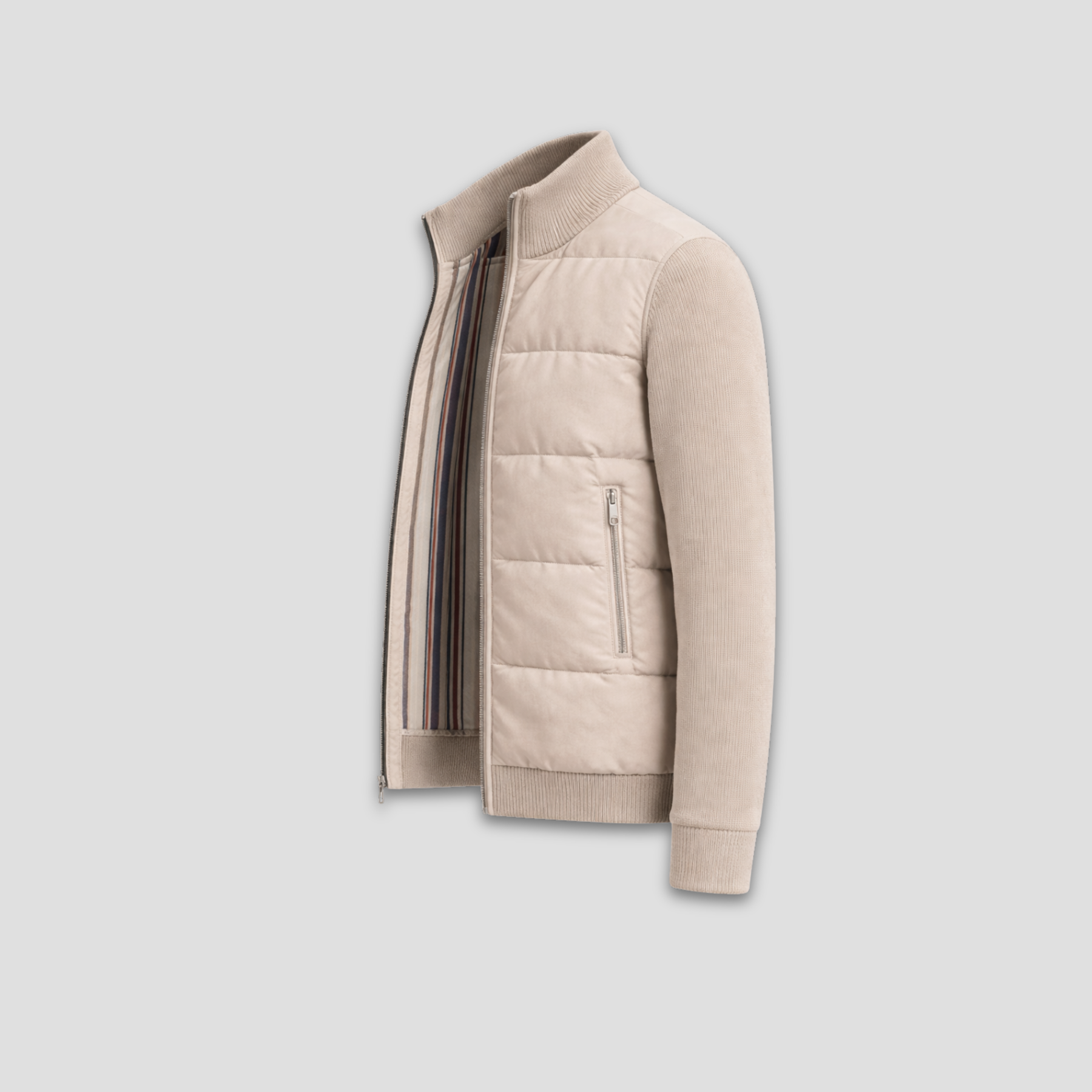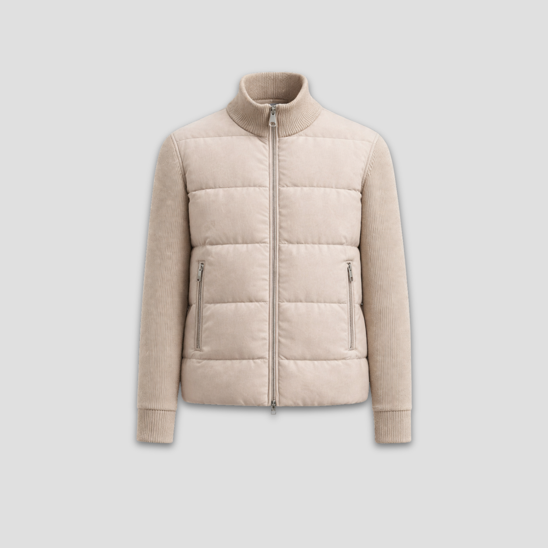 This quilted jacket blends soft knit sleeves with a padded front for a clean and modern look. Designed for comfort and warmth, it features a smooth zip-up closure and a structured stand collar. The lightweight insulation makes it ideal for everyday wear during cool weather. Ribbed cuffs and hem provide a secure and polished fit. Perfect for casual outings or smart layering.